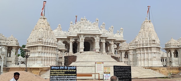 A grand, intricately carved white marble temple with multiple domes and spires, featuring extensive architectural details. The foreground includes some Hindi text on boards, a person, and what appears to be construction material like sand.